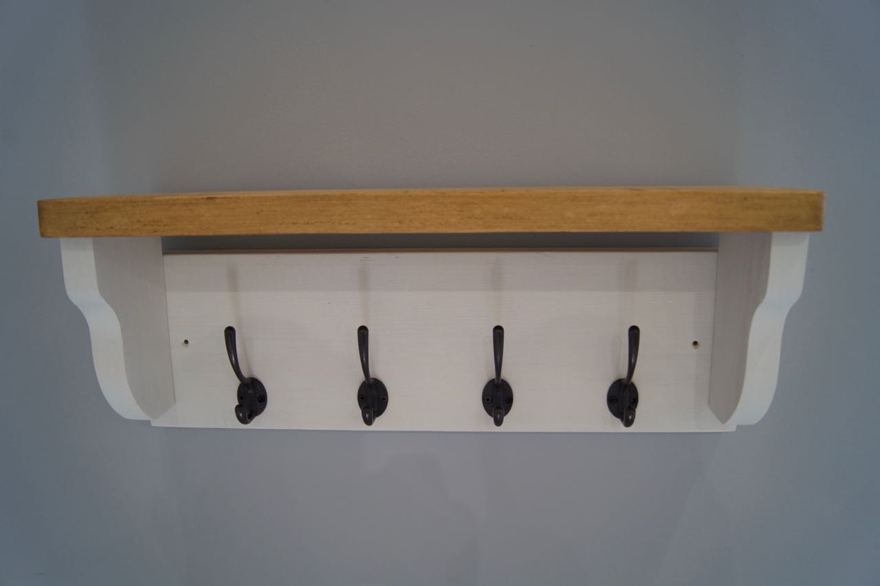 A Handmade shabby chic coat rack complete with a handy shelf and four gun metal grey / black cast Iron hooks
