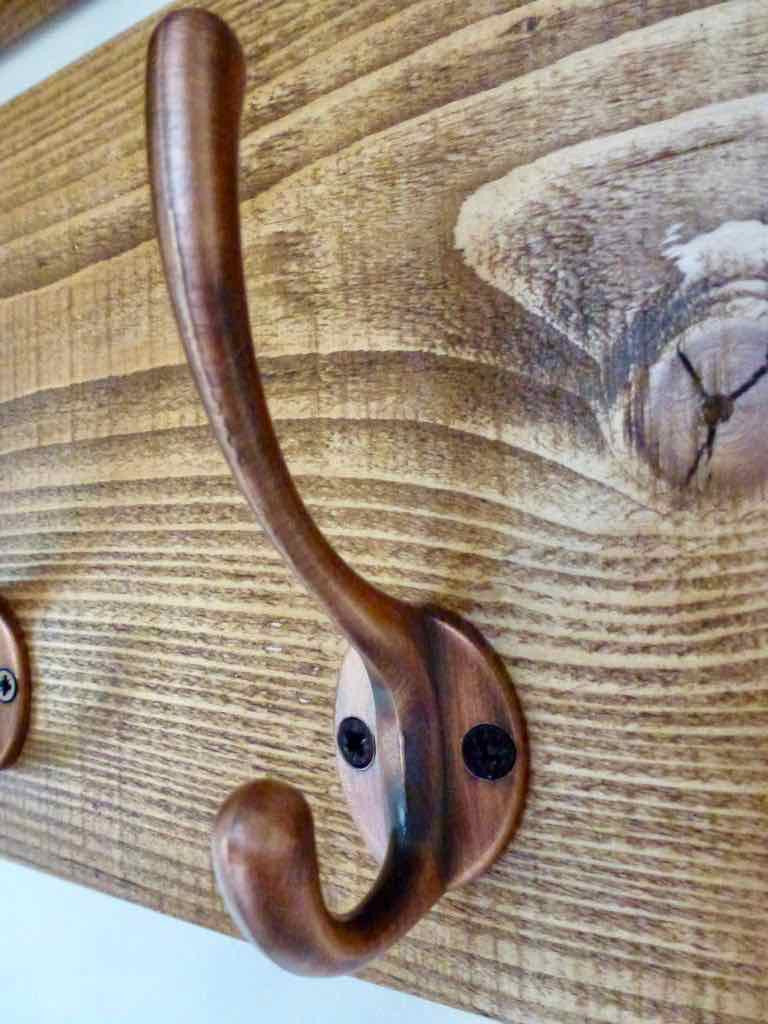 Handmade rustic solid wood coat rack complete with a handy shelf and five copper effect cast iron hooks.